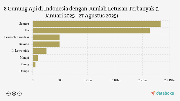 Selama tahun 2025, MAGMA Indonesia telah merekam 5.825 letusan/erupsi gunung api di seluruh Indonesia. Gunung Semeru di Jawa Timur paling banyak erupsi (2.330 kali letusan) sedangkan Gunung Ibu erupsi 2.132 kali.
