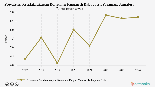 Badan Pusat Statistik (BPS) melaporkan, prevalensi ketidakcukupan pangan (Prevalence of Undernourishment/PoU) di Kabupaten Pasaman, Sumatera Barat sebesar 8,74% pada 2024.