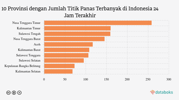 Titik panas terdeteksi paling banyak berada di Nusa Tenggara Timur sebanyak 258 titik. Kalimantan Timur menempati posisi kedua jumlah titik panas terbanyak dengan 160 titik. Sulawesi Tengah berada di posisi ketiga sebanyak 159 titik panas.