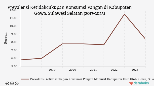 Melansir data Badan Pusat Statistik (BPS), prevalensi ketidakcukupan pangan (Prevalence of Undernourishment/PoU) di Kabupaten Gowa, Sulawesi Selatan mencapai 8,42% pada 2023.