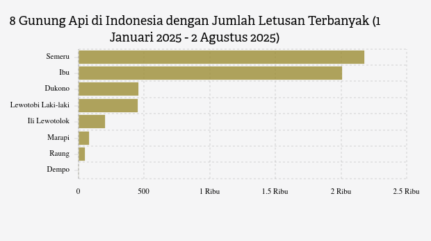 Selama tahun 2025, MAGMA Indonesia telah merekam 5.419 letusan/erupsi gunung api di seluruh Indonesia. Gunung Semeru di Jawa Timur paling banyak erupsi dengan 2.175 kali letusan.