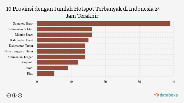 Titik panas terdeteksi paling banyak berada di Sumatera Barat sebanyak 39 titik. Kalimantan Selatan menempati posisi kedua jumlah titik panas terbanyak dengan 16 titik. Maluku Utara berada di posisi ketiga sebanyak 16 titik panas.