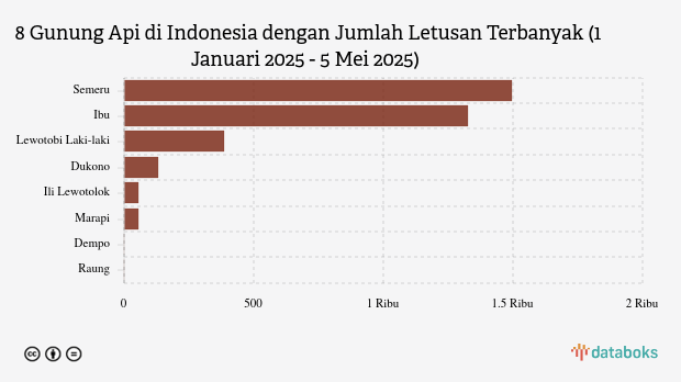 Selama tahun 2025, MAGMA Indonesia telah merekam 3.451 letusan/erupsi gunung api di seluruh Indonesia. Gunung Semeru di Jawa Timur paling banyak erupsi (1.494 kali letusan) sedangkan Gunung Ibu erupsi 1.326 kali.