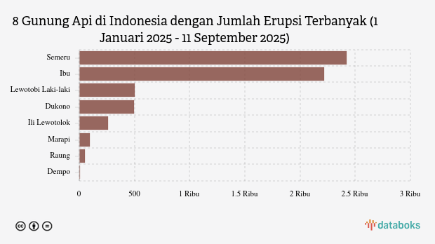 Selama tahun 2025, MAGMA Indonesia telah merekam 6.045 letusan/erupsi gunung api di seluruh Indonesia. Gunung Semeru di Jawa Timur paling banyak erupsi (2.422 kali letusan) sedangkan Gunung Ibu erupsi 2.218 kali.
