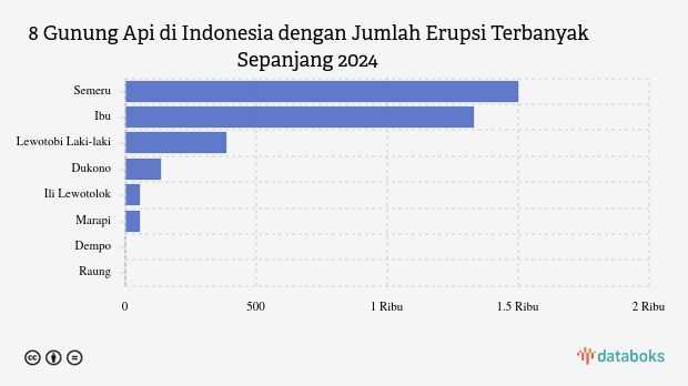 Selama tahun 2025, MAGMA Indonesia telah merekam 3.467 letusan/erupsi gunung api di seluruh Indonesia. Gunung Semeru di Jawa Timur paling banyak erupsi (1.498 kali letusan) sedangkan Gunung Ibu erupsi 1.332 kali.