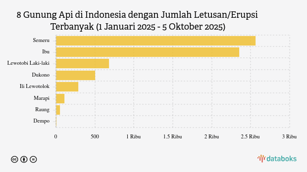 Selama tahun 2025, MAGMA Indonesia telah merekam 6.543 letusan/erupsi gunung api di seluruh Indonesia. Gunung Semeru di Jawa Timur paling banyak erupsi (2.561 kali letusan) sedangkan Gunung Ibu erupsi 2.354 kali.