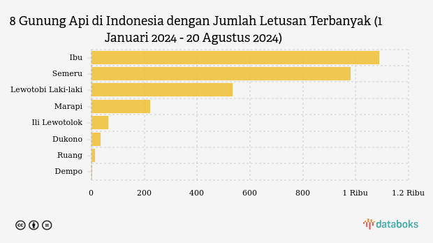 Selama tahun 2024, MAGMA Indonesia telah merekam 2.939 letusan/erupsi gunung api di seluruh Indonesia. Gunung Ibu di Maluku Utara paling banyak erupsi (1.089 kali letusan) sedangkan Gunung Lewotobi Laki-laki erupsi 533 kali.