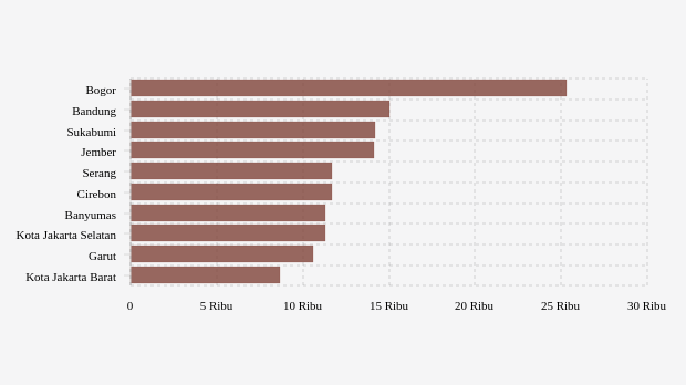 Rerata vaksinasi tiga kabupaten/kota teratas dengan angka di atas 14.000 dosis adalah Bogor, Bandung dan Sukabumi dengan masing-masing nilai 25.291 dosis, 15.027 dosis dan 14.222 dosis.