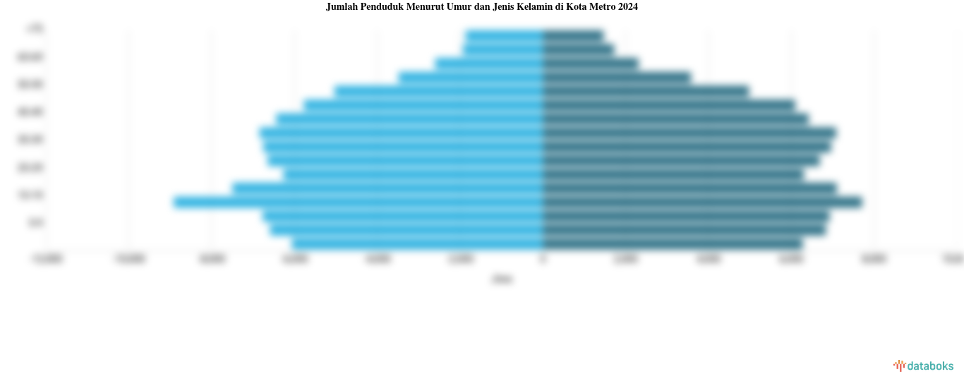 Distribusi penduduk menurut kelompok umur menunjukkan variasi yang signifikan. Kelompok umur 15-19 tahun menjadi kelompok dengan jumlah penduduk terbanyak yaitu 16.627 jiwa. Sementara itu, kelompok umur di atas 75 tahun menjadi kelompok dengan jumlah penduduk paling sedikit yaitu 3.334 jiwa. Ini mengindikasikan bahwa Kota Metro memiliki proporsi penduduk usia muda yang cukup besar, sementara proporsi penduduk usia lanjut relatif lebih kecil.