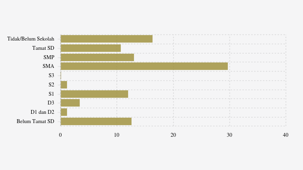 Selanjutnya, proporsi penduduk dengan tamatan SMA sebesar 29,7%. Lulusan SMP dan SD masing-masing 12,98% dan 10,71%.