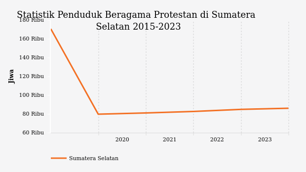 Penduduk beragama Protestan di Provinsi Sumatera Selatan, data per 31 Desember 2023 tercatat 86.346 jiwa. Dibandingkan dengan tahun sebelumnya, jumlah penduduk memeluk agama Protestan di provinsi bertambah 1.169 jiwa