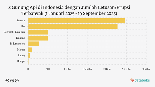 Selama tahun 2025, MAGMA Indonesia telah merekam 6.161 letusan/erupsi gunung api di seluruh Indonesia. Gunung Semeru di Jawa Timur paling banyak erupsi (2.462 kali letusan) sedangkan Gunung Lewotobi Laki-laki erupsi 508 kali.