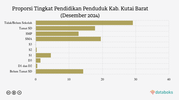 Sementara itu, ada 14,19% penduduk Kabupaten Kutai Barat yang belum tamat SD. Adapun penduduk yang tidak/belum sekolah sejumlah 29,14%.