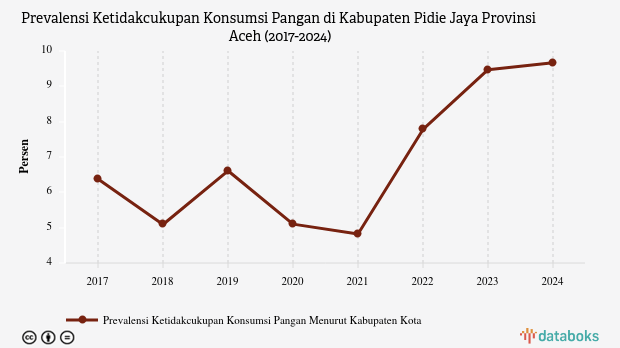Badan Pusat Statistik (BPS) melaporkan, prevalensi ketidakcukupan pangan (Prevalence of Undernourishment/PoU) di Kabupaten Pidie Jaya, Aceh mencapai 9,67% pada 2024.