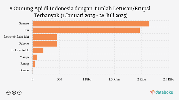 Selama tahun 2025, MAGMA Indonesia telah merekam 5.318 letusan/erupsi gunung api di seluruh Indonesia. Gunung Semeru di Jawa Timur paling banyak erupsi dengan 2.141 kali letusan.