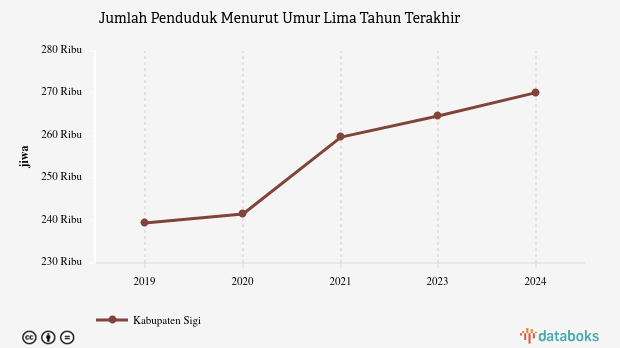 Jumlah penduduk di Kabupaten Sigi tercatat 270,19 ribu jiwa data per 2024. Untuk 14 tahun terakhir, jumlah penduduk terus naik. Selama lima tahun terakhir, rata-rata pertumbuhan tahunan (CAGR) jumlah penduduk di wilayah ini sebesar 2,45%. Pertumbuhan ini lebih tinggi dibandingkan dengan pertumbuhan lima tahun sebelumnya yang tercatat 0,88%.