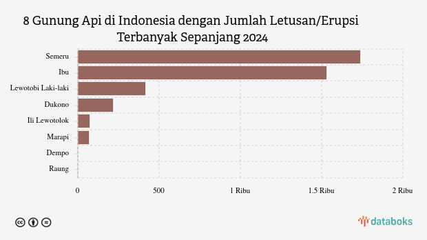 Selama tahun 2025, MAGMA Indonesia telah merekam 4.038 letusan/erupsi gunung api di seluruh Indonesia. Gunung Semeru di Jawa Timur paling banyak erupsi (1.737 kali letusan) sedangkan Gunung Ibu erupsi 1.528 kali.