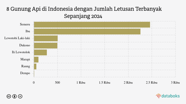 Selama tahun 2025, MAGMA Indonesia telah merekam 6.137 letusan/erupsi gunung api di seluruh Indonesia. Gunung Semeru di Jawa Timur paling banyak erupsi (2.457 kali letusan) sedangkan Gunung Ibu erupsi 2.259 kali.