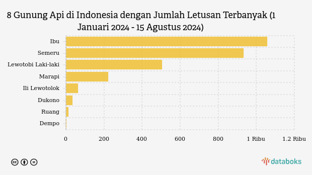 Selama tahun 2024, MAGMA Indonesia telah merekam 2.830 letusan/erupsi gunung api di seluruh Indonesia. Gunung Ibu di Maluku Utara paling banyak erupsi dengan 1.057 kali letusan.