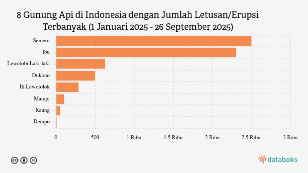 Selama tahun 2025, MAGMA Indonesia telah merekam 6.358 letusan/erupsi gunung api di seluruh Indonesia. Gunung Semeru di Jawa Timur paling banyak erupsi dengan 2.500 kali letusan.