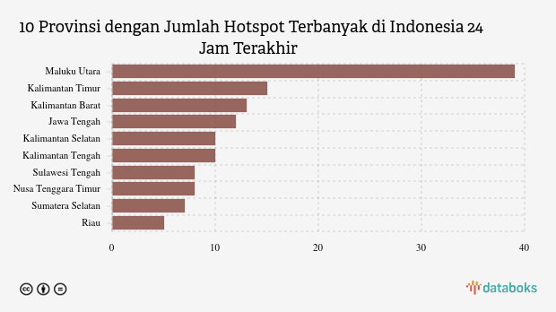 Titik panas terdeteksi paling banyak berada di Maluku Utara sebanyak 39 titik. Kalimantan Timur menempati posisi kedua jumlah titik panas terbanyak dengan 15 titik. Kalimantan Barat berada di posisi ketiga sebanyak 13 titik panas.