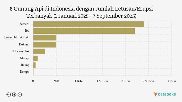 Selama tahun 2025, MAGMA Indonesia telah merekam 5.993 letusan/erupsi gunung api di seluruh Indonesia. Gunung Semeru di Jawa Timur paling banyak erupsi (2.401 kali letusan) sedangkan Gunung Ibu erupsi 2.197 kali.