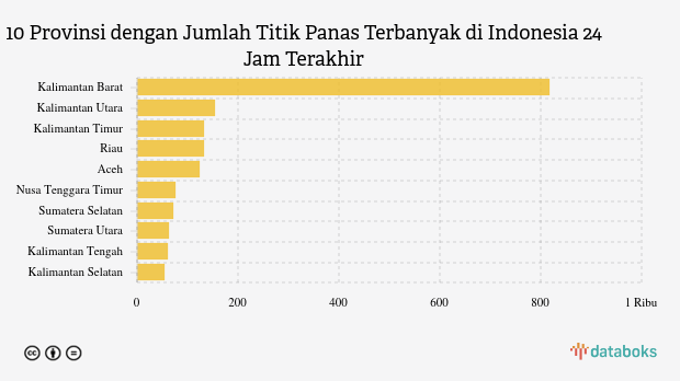 Titik panas terdeteksi paling banyak berada di Kalimantan Barat sebanyak 817 titik. Kalimantan Utara menempati posisi kedua jumlah titik panas terbanyak dengan 155 titik. Kalimantan Timur berada di posisi ketiga sebanyak 132 titik panas.
