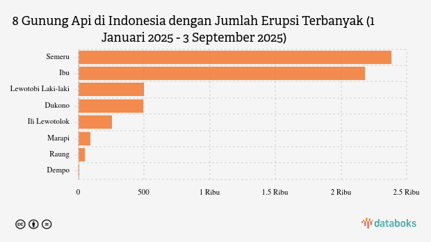Selama tahun 2025, MAGMA Indonesia telah merekam 5.953 letusan/erupsi gunung api di seluruh Indonesia. Gunung Semeru di Jawa Timur paling banyak erupsi (2.383 kali letusan) sedangkan Gunung Ili Lewotolok erupsi 255 kali.