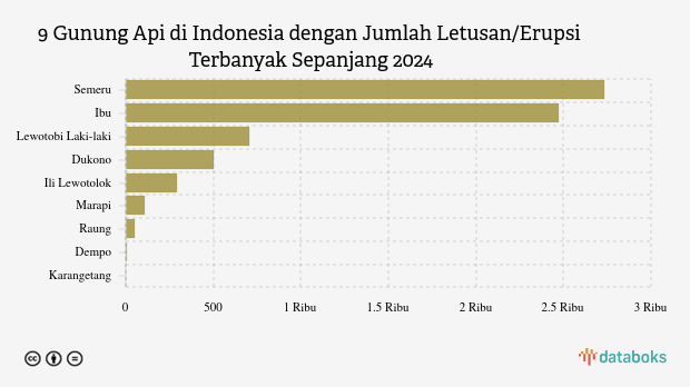 Selama tahun 2025, MAGMA Indonesia telah merekam 6.862 letusan/erupsi gunung api di seluruh Indonesia. Gunung Semeru di Jawa Timur paling banyak erupsi dengan 2.733 kali letusan.