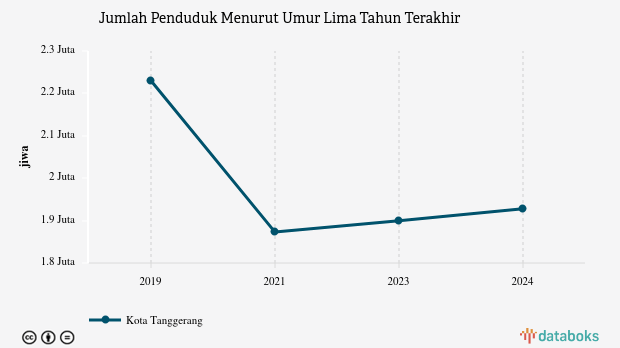 Jumlah penduduk di Kota Tanggerang tercatat 1,93 juta jiwa data per 2024. Angka ini bertambah dibanding 2023 dan lebih tinggi dibanding Desember 2021. Selama lima tahun terakhir, rata-rata pertumbuhan tahunan (CAGR) jumlah penduduk di wilayah ini turun 2,48%. Pertumbuhan ini lebih rendah dibandingkan dengan pertumbuhan lima tahun sebelumnya yang tercatat 1,85%.