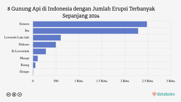 Selama tahun 2025, MAGMA Indonesia telah merekam 6.308 letusan/erupsi gunung api di seluruh Indonesia. Gunung Semeru di Jawa Timur paling banyak erupsi (2.481 kali letusan) sedangkan Gunung Lewotobi Laki-laki erupsi 605 kali.