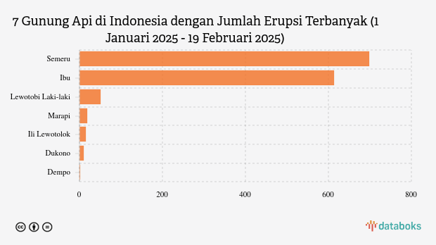 Selama tahun 2025, MAGMA Indonesia telah merekam 1.409 letusan/erupsi gunung api di seluruh Indonesia. Gunung Semeru di Jawa Timur paling banyak erupsi dengan 699 kali letusan.