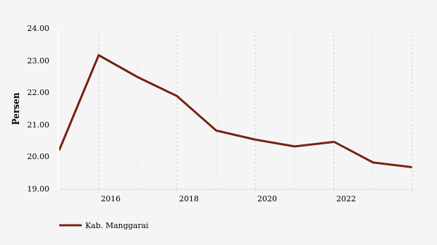 Perkembangan persentase penduduk miskin dalam 10 tahun di kabupaten Manggarai dalam tren turun, bergerak dari kemiskinan sebesar 20,22 persen menuju ke 19,69 persen.
