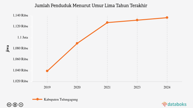 Jumlah penduduk di Kabupaten Tulungagung tercatat 1,14 juta jiwa data per 2024. Untuk 19 tahun terakhir, jumlah penduduk tercatat naik. Dibandingkan dengan lima tahun sebelumnya, rata-rata pertumbuhan tahunan (CAGR) wilayah ini tercatat lebih tinggi. Adapun pertumbuhan lima tahun terakhir, tercatat diangka 1,81%.