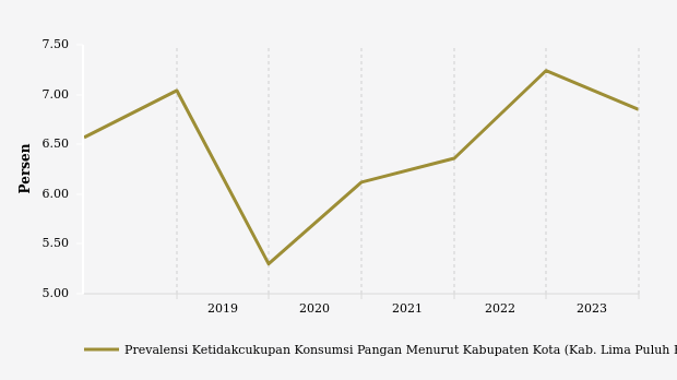 Badan Pusat Statistik (BPS) melaporkan, prevalensi ketidakcukupan pangan (Prevalence of Undernourishment/PoU) di Kabupaten Lima Puluh Kota, Sumatera Barat mencapai 6,85% pada 2023.