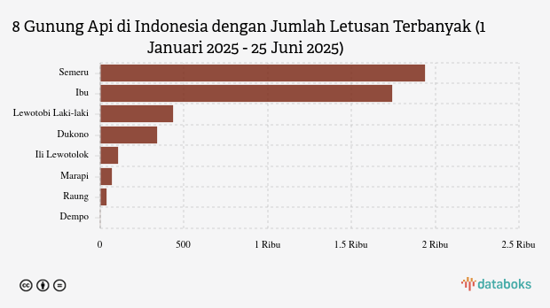 Selama tahun 2025, MAGMA Indonesia telah merekam 4.670 letusan/erupsi gunung api di seluruh Indonesia. Gunung Semeru di Jawa Timur paling banyak erupsi dengan 1.939 kali letusan.