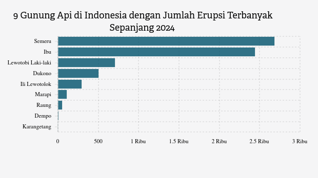 Selama tahun 2025, MAGMA Indonesia telah merekam 6.784 letusan/erupsi gunung api di seluruh Indonesia. Gunung Semeru di Jawa Timur paling banyak erupsi (2.682 kali letusan) sedangkan Gunung Ibu erupsi 2.443 kali.