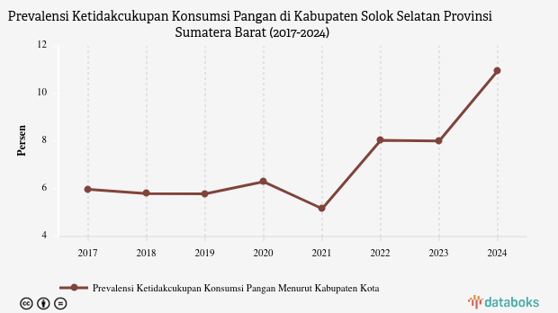 Badan Pusat Statistik (BPS) melaporkan, prevalensi ketidakcukupan pangan (Prevalence of Undernourishment/PoU) di Kabupaten Solok Selatan, Sumatera Barat mencapai 10,95% pada 2024.