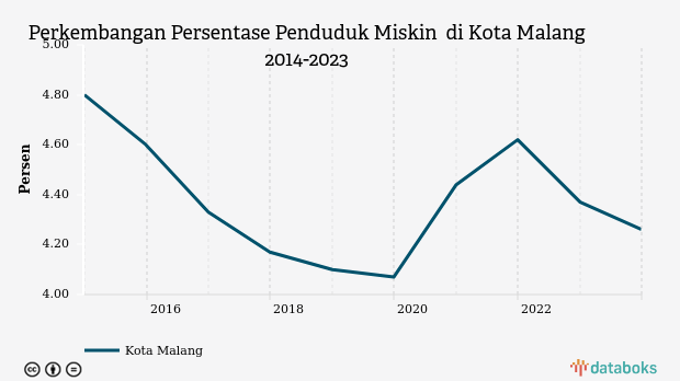 Persentase penduduk miskin di kota Malang, data per 30 November 2023 tercatat 4,26 persen. Jumlah ini turun 0,11 persen dibandingkan tahun sebelumnya yang dilaporkan 4,37 persen.