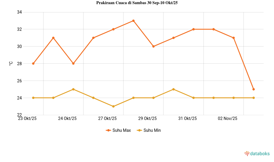 Untuk suhu di Sambas, tertinggi terjadi pada tanggal Selasa, 28 Oktober 2025 dengan suhu 33 °C dan terendah yakni 23°C yang terjadi pada Senin, 27 Oktober 2025. Tingkat kelembaban yang tinggi turut memperberat rasa panas. Berikut ini detail cuaca harian seminggu ke depan di kota Sambas :
