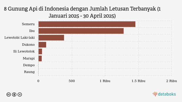 Selama tahun 2025, MAGMA Indonesia telah merekam 3.336 letusan/erupsi gunung api di seluruh Indonesia. Gunung Semeru di Jawa Timur paling banyak erupsi dengan 1.453 kali letusan.