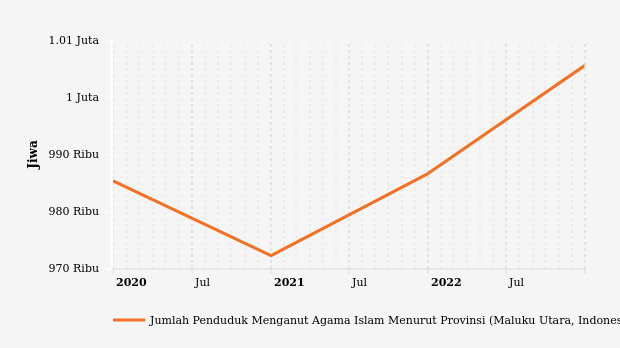 Penduduk beragama Islam di Provinsi Maluku Utara, data per 31 Desember 2022 tercatat 1,01 juta jiwa. Jumlah ini bertambah 18.984 jiwa dibandingkan tahun sebelumnya yang dilaporkan 986,74 ribu jiwa.