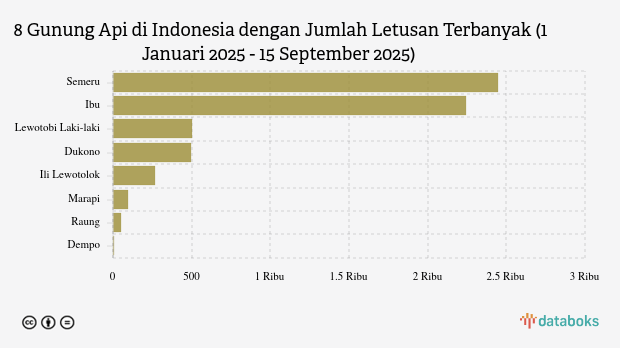 Selama tahun 2025, MAGMA Indonesia telah merekam 6.106 letusan/erupsi gunung api di seluruh Indonesia. Gunung Semeru di Jawa Timur paling banyak erupsi (2.450 kali letusan) sedangkan Gunung Ibu erupsi 2.243 kali.