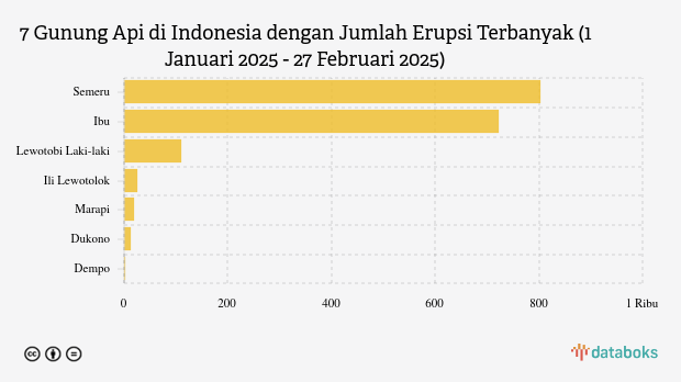 Selama tahun 2025, MAGMA Indonesia telah merekam 1.695 letusan/erupsi gunung api di seluruh Indonesia. Gunung Semeru di Jawa Timur paling banyak erupsi dengan 803 kali letusan.