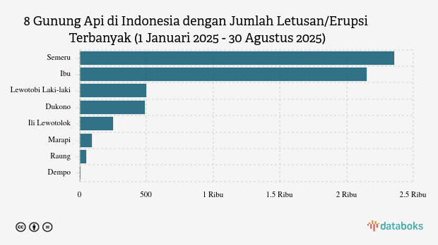 Selama tahun 2025, MAGMA Indonesia telah merekam 5.893 letusan/erupsi gunung api di seluruh Indonesia. Gunung Semeru di Jawa Timur paling banyak erupsi dengan 2.359 kali letusan.