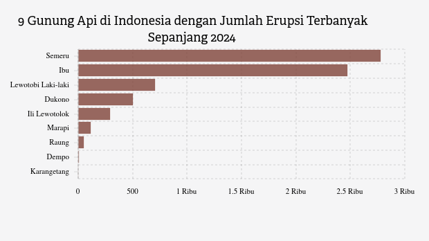 Selama tahun 2025, MAGMA Indonesia telah merekam 6.911 letusan/erupsi gunung api di seluruh Indonesia. Gunung Semeru di Jawa Timur paling banyak erupsi (2.775 kali letusan) sedangkan Gunung Ibu erupsi 2.474 kali.