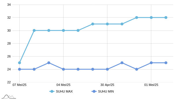 Untuk suhu di Kota Tangerang, tertinggi terjadi pada tanggal Kamis, 01 Mei 2025 dengan suhu 32 °C dan terendah yakni 24°C yang terjadi pada Minggu, 27 April 2025. Tingkat kelembaban yang tinggi turut memperberat rasa panas. Berikut ini detail cuaca harian seminggu ke depan di kota Kota Tangerang :