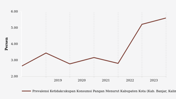 Badan Pusat Statistik (BPS) melaporkan, prevalensi ketidakcukupan pangan (Prevalence of Undernourishment/PoU) di Kabupaten Banjar, Kalimantan Selatan mencapai 5,61% pada 2023.