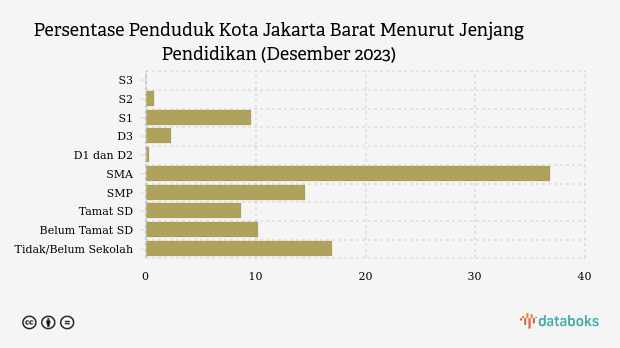 Jumlah penduduk Kota Jakarta Barat, DKI Jakarta menurut jenjang pendidikan per Desember 2023 mencapai 2,61 juta jiwa.