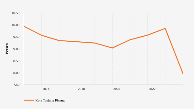 Perkembangan persentase penduduk miskin dalam 10 tahun di Kota Tanjung Pinang dalam tren turun dari yang semula kemiskinan sebesar 9,94 persen menuju ke 7,95 persen.